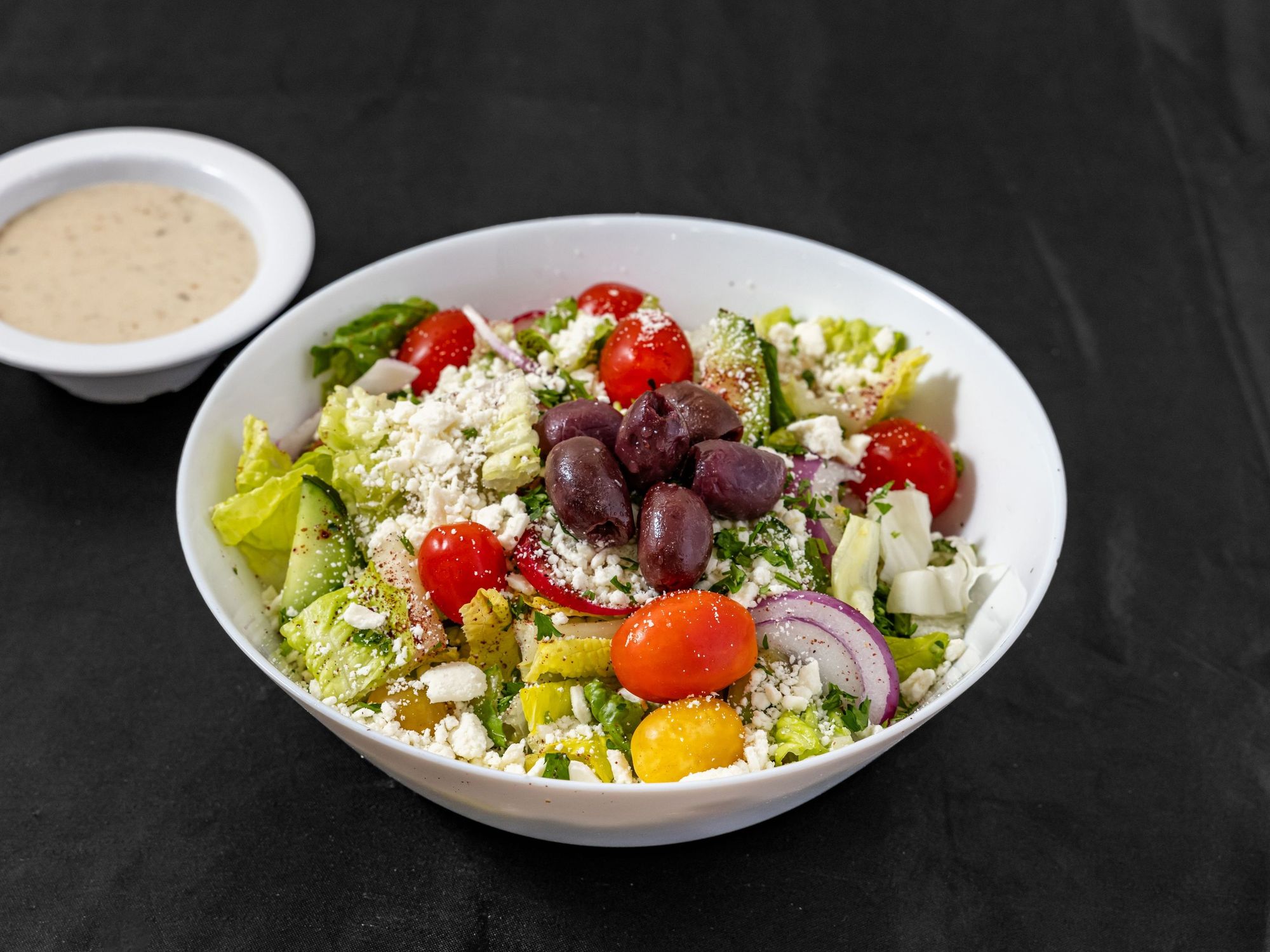 Crisp lettuce, juicy cherry tomatoes, sliced red onions, cucumbers, kalamata olives, and crumbled feta cheese.