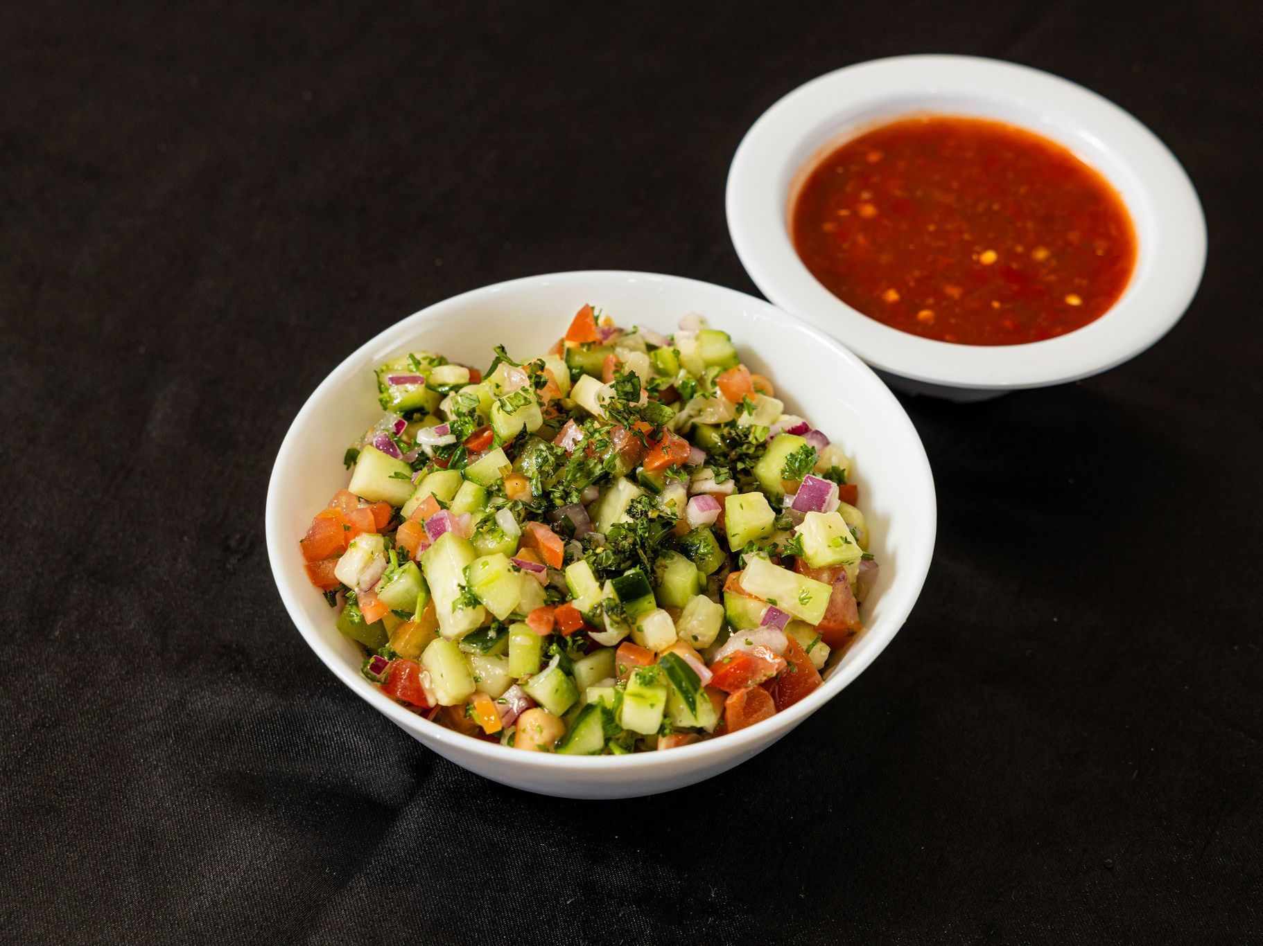 A mix of diced cucumbers, tomatoes, onions, and parsley, seasoned with lemon juice and olive oil. The freshest Iraqi Salad you'll ever taste